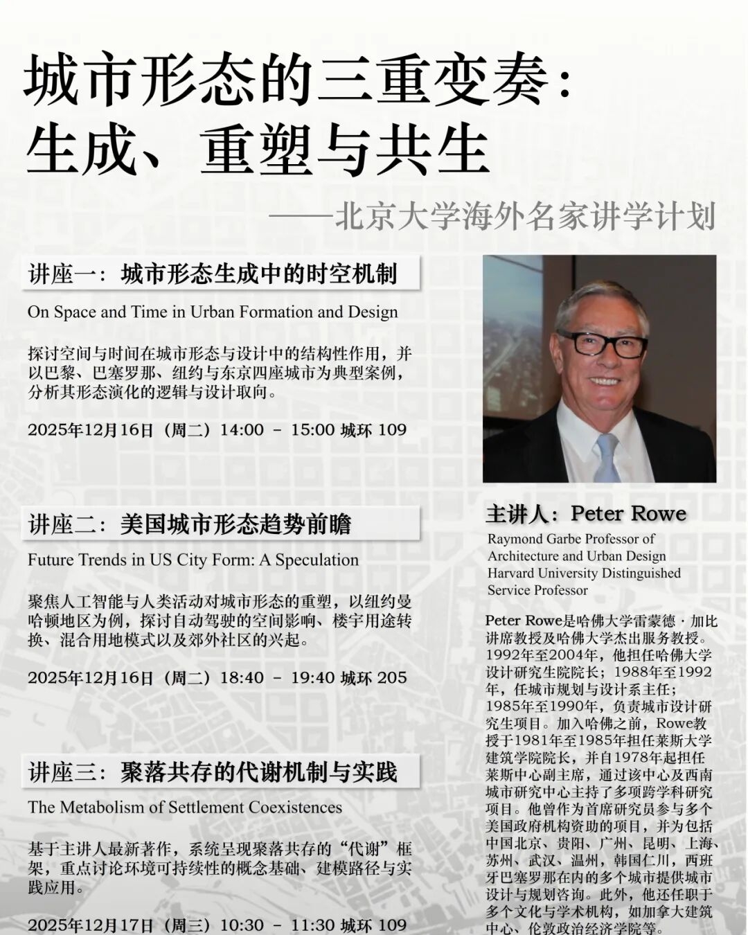 Lecture 1: On Space and Time in Urban Formation and DesignTime: 14:00 - 15:00, December 16, 2025Venue: Room 109, College of Urban and Environmental Sciences, Peking UniversityAbstract: Lecture will discuss the role of space and time in urban design and formati...