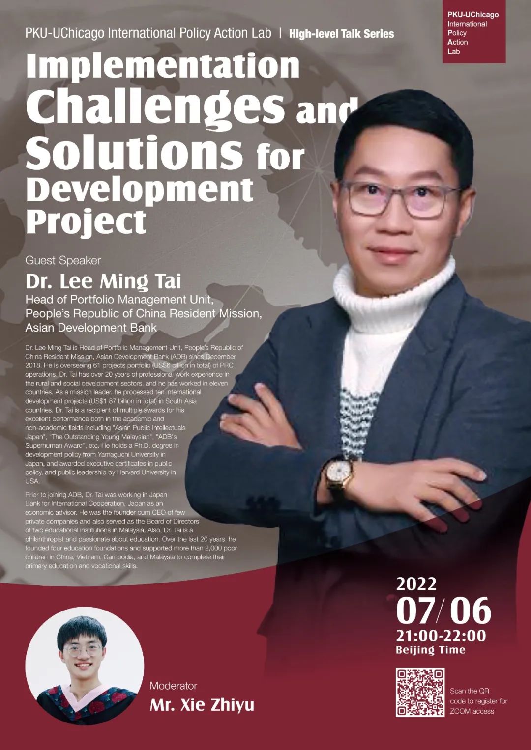 Biography: Dr Lee Ming Tai is Head of Portfolio Management Unit, People's Republic of China Resident Mission, Asian Development Bank (ADB) since December 2018. He is overseeing 61 projects portfolio (US$ 6 bilion in total) of PRC