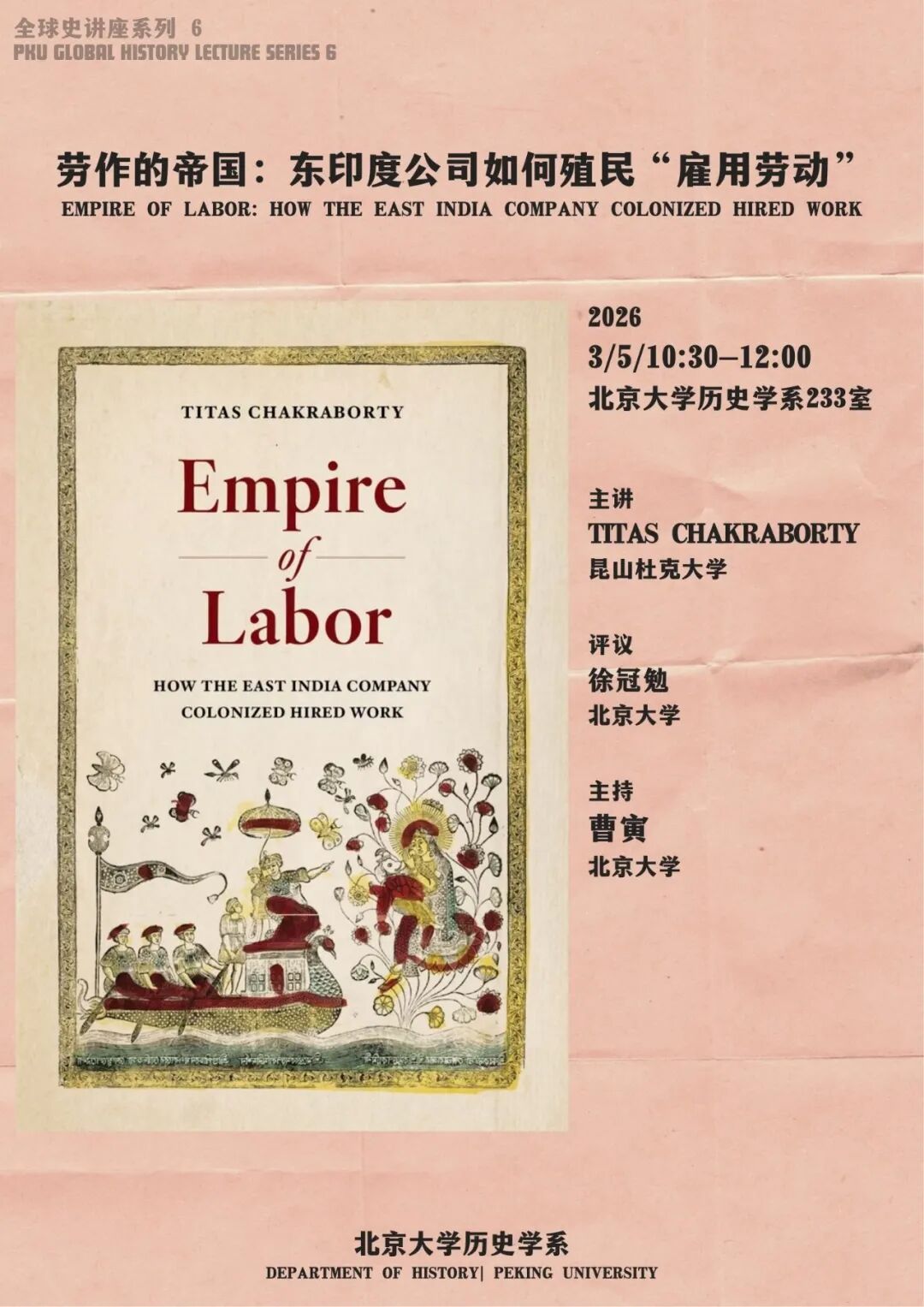 Abstract: This lecture is focused on the experience of hired laborers in South Asia during the rise of the East India Company. By perusing Bangladeshi literature as well as Dutch and British historical documents, the lecturer has shone a new light on the rise of corporate state, recasting it as a violent process that dismantled the local labor culture by eliminating competition and oppressing the workers through the use of police and military. More importantly, the lecturer tries to rebuild the world of these "obstinate" laborers, revealing how their protests were rooted in their everyday lives.