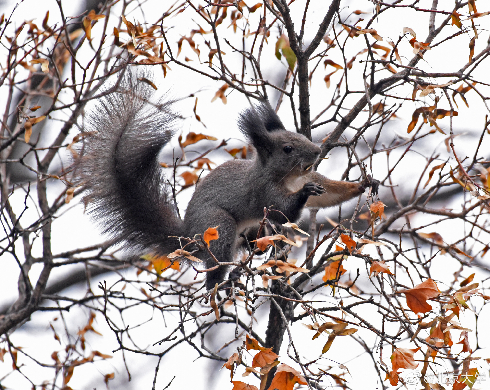 In the hills and forests of Weiming Lake, a black-clad creature delights in every season. The Eurasian red squirrel (Sciurus vulgaris), leaping among branches or dining on tree perches, represents the first harbinger of life in PKU. With its predominantly gray and black fur, accented by a white chest and abdomen, this squirrel is most captivating. It relishes a varied diet of leaves, shoots, fruit seeds, and insects. Yet, during scarce winters, it occasionally descends to scavenge for cat food, all while being playfully pursued by gray magpies.