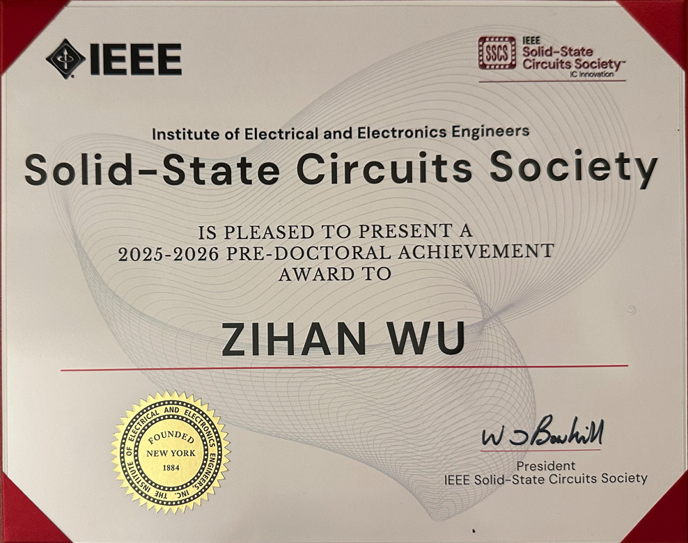 The award, established this year by the IEEE Solid-State Circuits Society (SSCS), honors pioneering circuit researcher Kenneth C. Smith and recognizes exceptional doctoral researchers in solid-state circuits. As one of the most prestigious recognitions for PhD students in integrated circuit research, no more than two recipients are selected worldwide each year, highlighting the significance of Wu’s achievement.