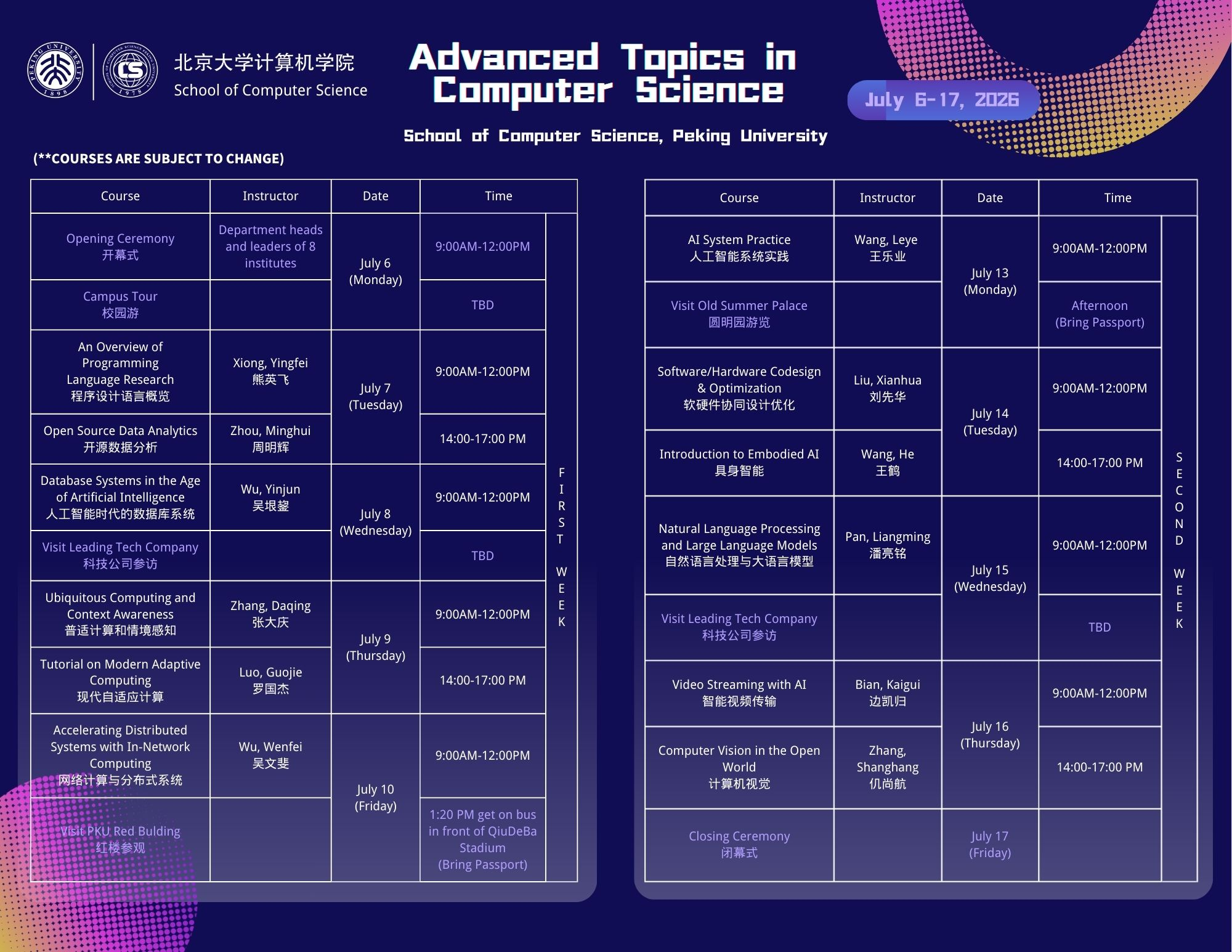 Join the PKU School of Computer Science International Summer School: a two-week, English-taught program for outstanding CS undergraduates worldwide. Learn from leading PKU faculty, explore frontier topics from programming languages to embodied AI, and experience China’s vibrant tech ecosystem through company visits, academic exchange, and cultural activities.