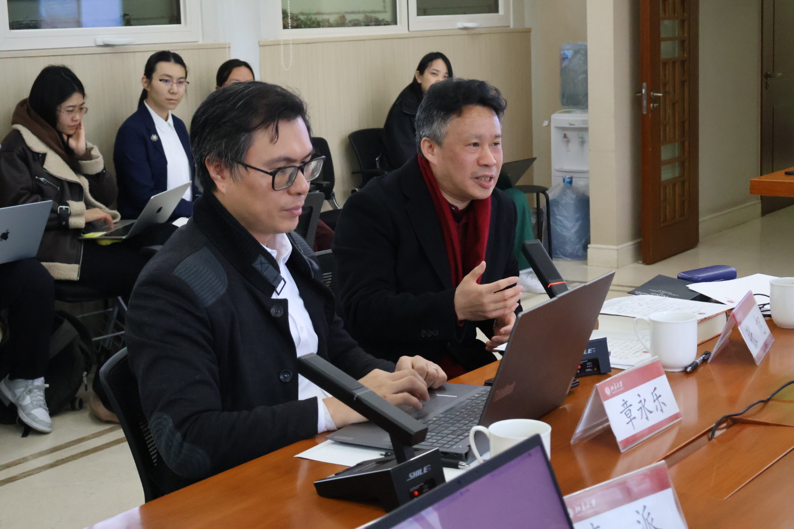 Professor Zhang Yongle and Professor Zhang Xu speak at the lecture.