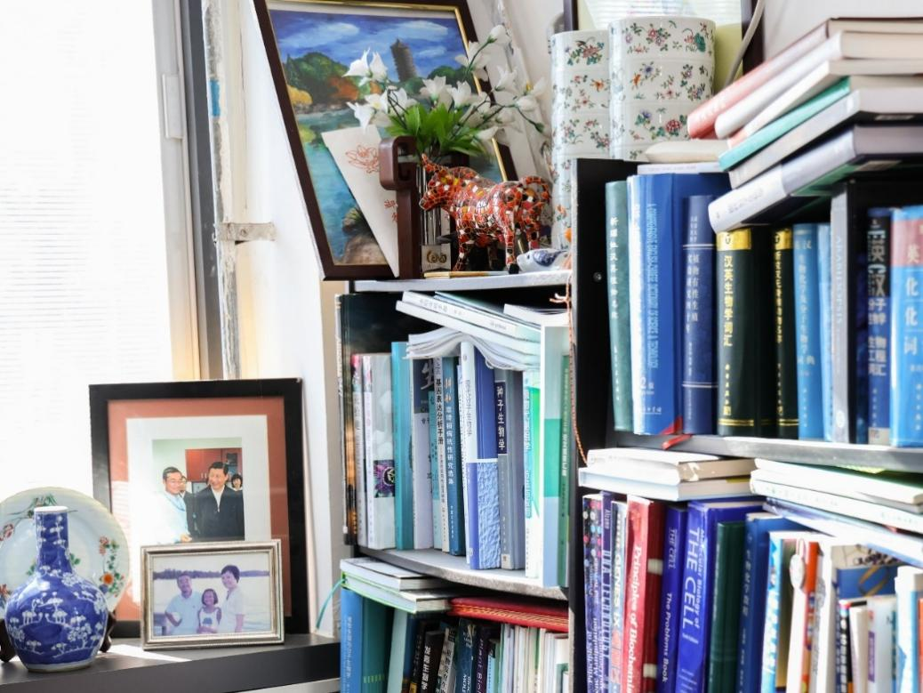 Qu's book shelf with a photo of him and President Xi.