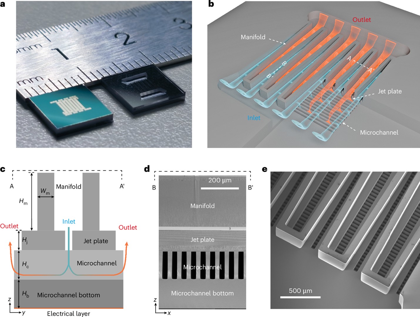The system can manage extremely high heat fluxes, reaching up to 3,000 W/cm², which is critical for modern high-power devices such as wide-bandgap semiconductors. It achieves these rates with very low energy input, requiring less than 1 W/cm² of pumping power. The cooling structure is embedded directly into the device, creating a compact and efficient solution for applications with high power density. Importantly, the design can be fabricated using standard Micro-Electro-Mechanical Systems (MEMS) techniques, making it compatible with existing semiconductor manufacturing and paving the way for future scalability in commercialization.