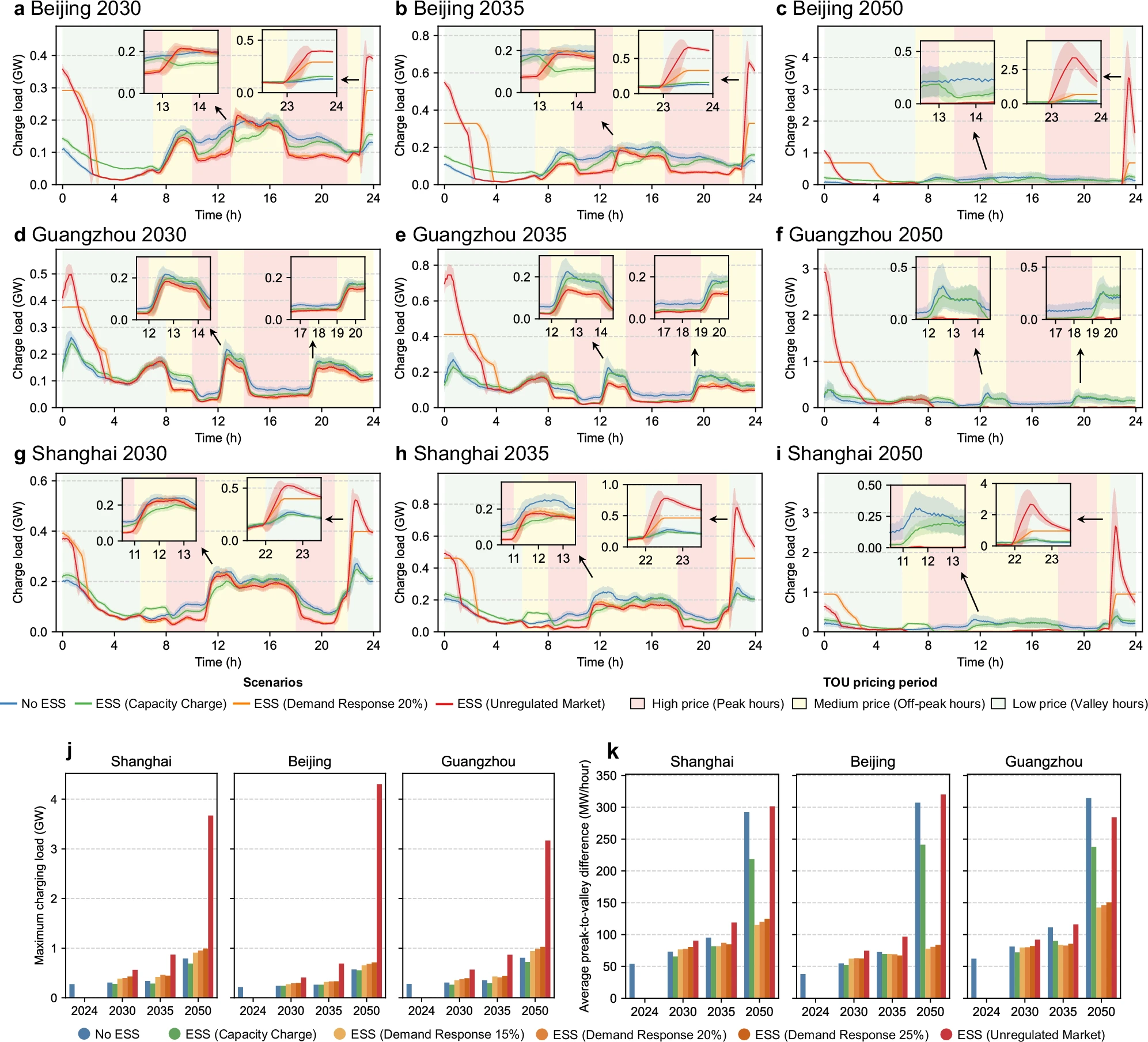 The research team analyzed over 760,000 public charging records and modeled grid load changes under varying UFCS deployment scales, also examining energy storage systems (ESS) under different regulatory scenarios. While time-of-use (TOU) pricing shifts most charging to nighttime, it can trigger sharp “secondary peaks” when prices drop, as it induces a spike in charging demand at the beginning of lower rate periods. A wide adoption of UFCS can exacerbate this problem. Deploying 2,000 UFCS stations could raise the daily peak-to-valley load difference (the difference between the highest and lowest load demand) by 31.61%, straining reserves and increasing instability risks. While ESS can smooth load curves through energy arbitrage, but in unregulated markets, it may create larger peaks—up to 7.5 times by 2050 compared to the baseline without ESS. Under regulated frameworks, ESS stabilizes the grid, though large-scale UFCS deployment still exposes structural vulnerabilities in electricity markets.