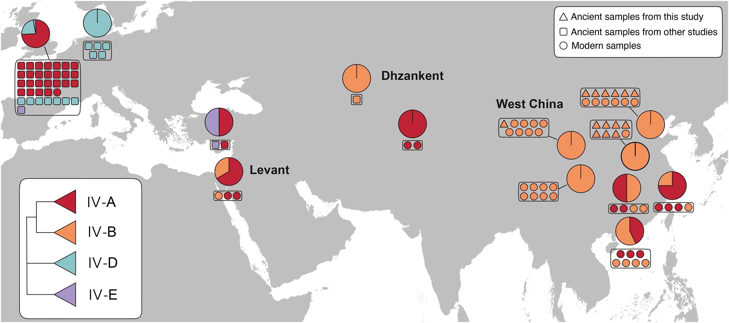 Fig. 2. Geographical distribution of mtDNA haplogroups in Eurasian domestic cats, highlighting a human-mediated dispersal route into China via the Silk Road.