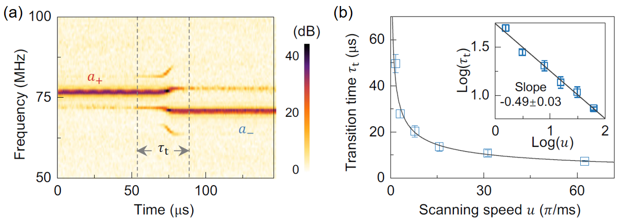 Figure 2. (a) Measured dynamic switching process between two lasing states. (b) Power scaling law of the transition time versus the scanning speed of the control parameter.